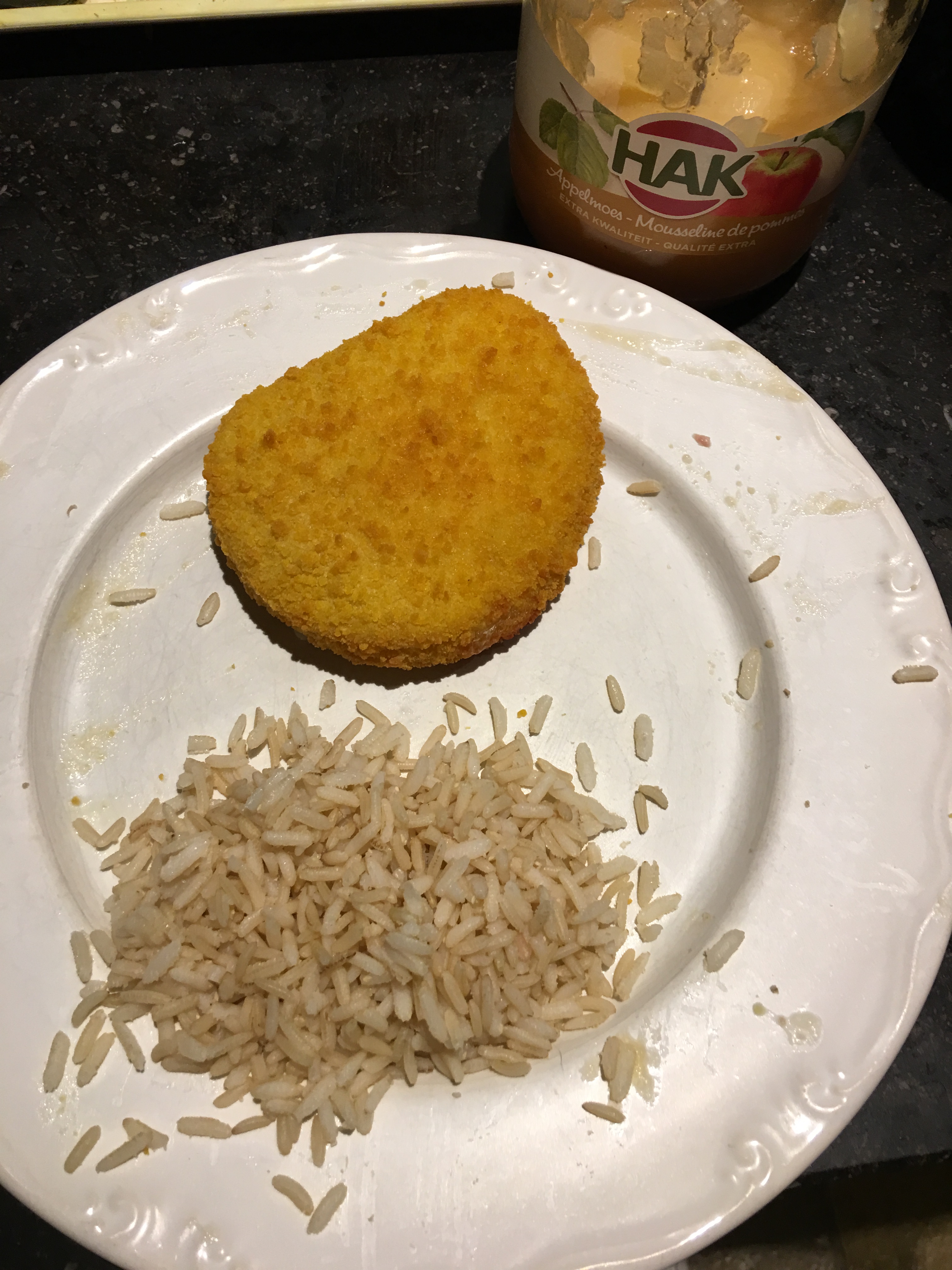 For dinner I ate chicken with cheese and ham in it. I am in love with those😍. I ate some whole grain rice with apple mouse. This was a lovely dinner. I drank also a mini can of Coca Cola Light.