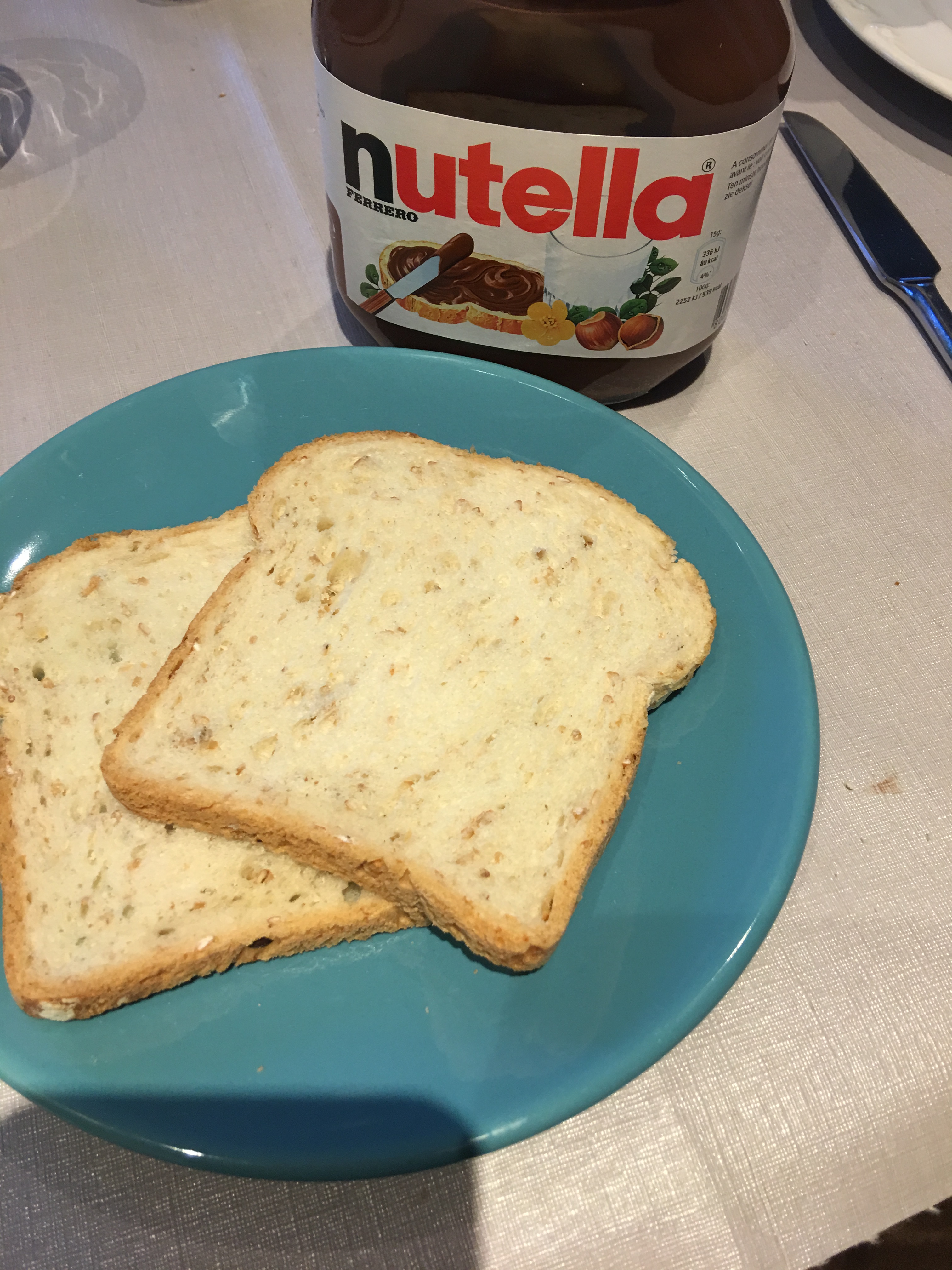 To start the day I ate two slices of polder bread with nutella!😋 I don’t drink much in the morning so today i drank some water because I don’t like milk or fruit juice in the morning.